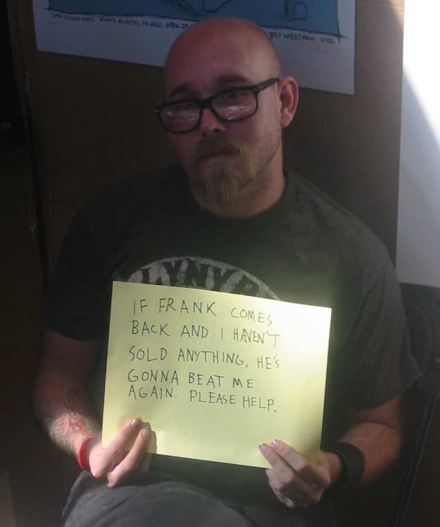 sullen with a sign below his chin, apparently not doing